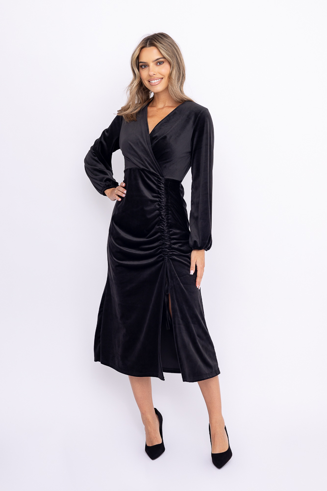 Czarna Sukienka welurowa z marszczeniem PERTIMENA